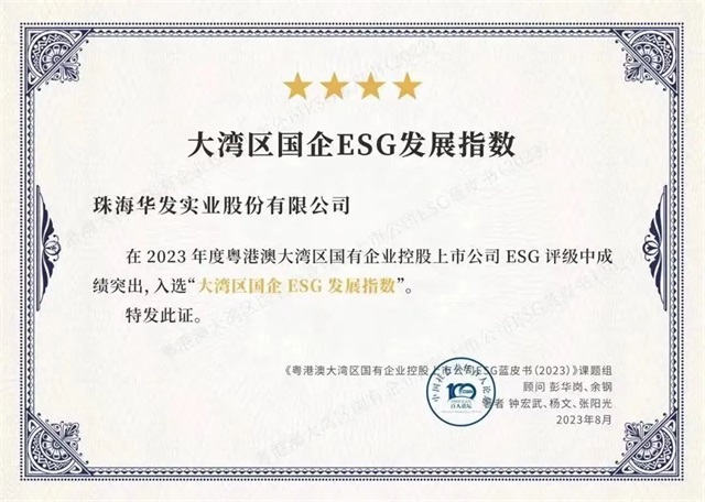 在今年8月11日的“ESG中国论坛2023广东峰会”上,凭借粤港澳大湾区国有企业控股上市公司ESG评级中的突出成绩,华发股份成功入选首批“大湾区国企ESG发展指数”。